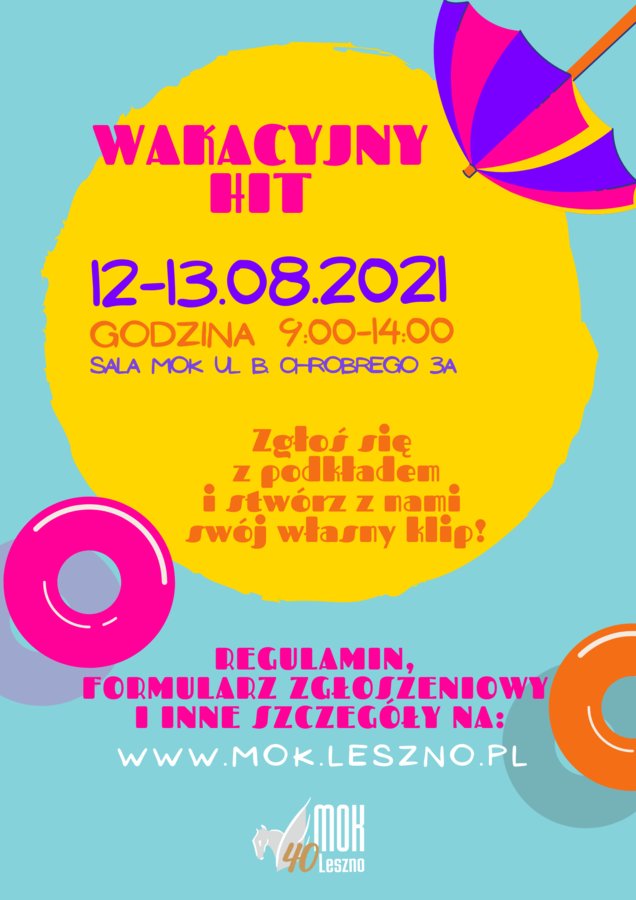WAKACYJNY HIT to utwór, który zapada w pamięć na wiele lat. Często nucimy go nie tylko w wakacje. Teraz nadarza się okazja by go wyśpiewać w akcji pod nazwą … „Wakacyjny hit”. Nasza scena w Miejskim Ośrodku Kultury została do tego specjalnie zaaranżowana, nie brakuje tu wakacyjnych akcentów. Właśnie w takiej scenerii będzie można nagrać swój ulubiony, wakacyjny utwór.