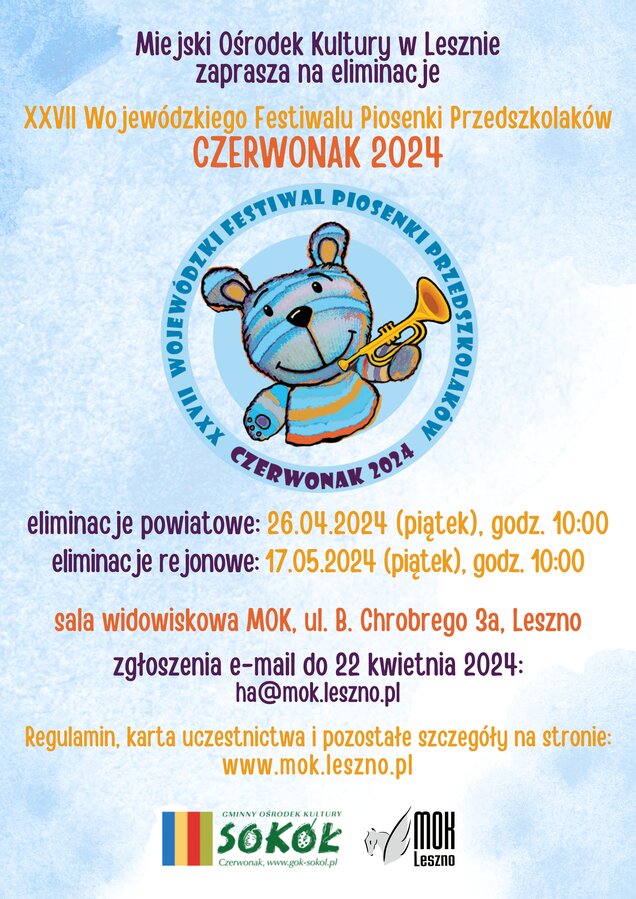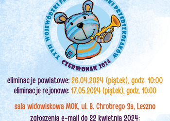 Miejski Ośrodek Kultury w Lesznie, ponownie zaprasza do udziału w XXVII Wojewódzkim Festiwalu Piosenki Przedszkolaków - CZERWONAK 2024 (regulamin w załączeniu).