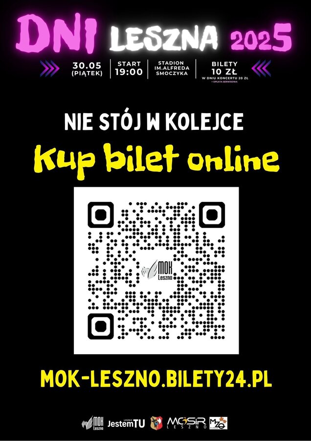 W piątek 30 maja – czyli w dniu koncertów na stadionie – cena biletów wzrasta do 20 zł. Nadal będzie można je nabyć on-line na www.mok-leszno.bilety24.pl oraz stacjonarnie, ale tego dnia kasę przenosimy pod stadion.